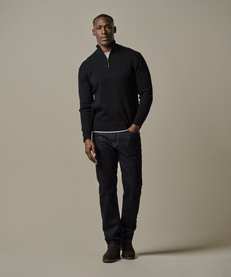 Half Zip Pullover aus einem weichen Wollmix mit Modalanteil. Der Stehkragen und der Metallreissverschluss bringen Struktur und eine leichte Note von Lässigkeit, ohne die klare Linie zu verlieren.