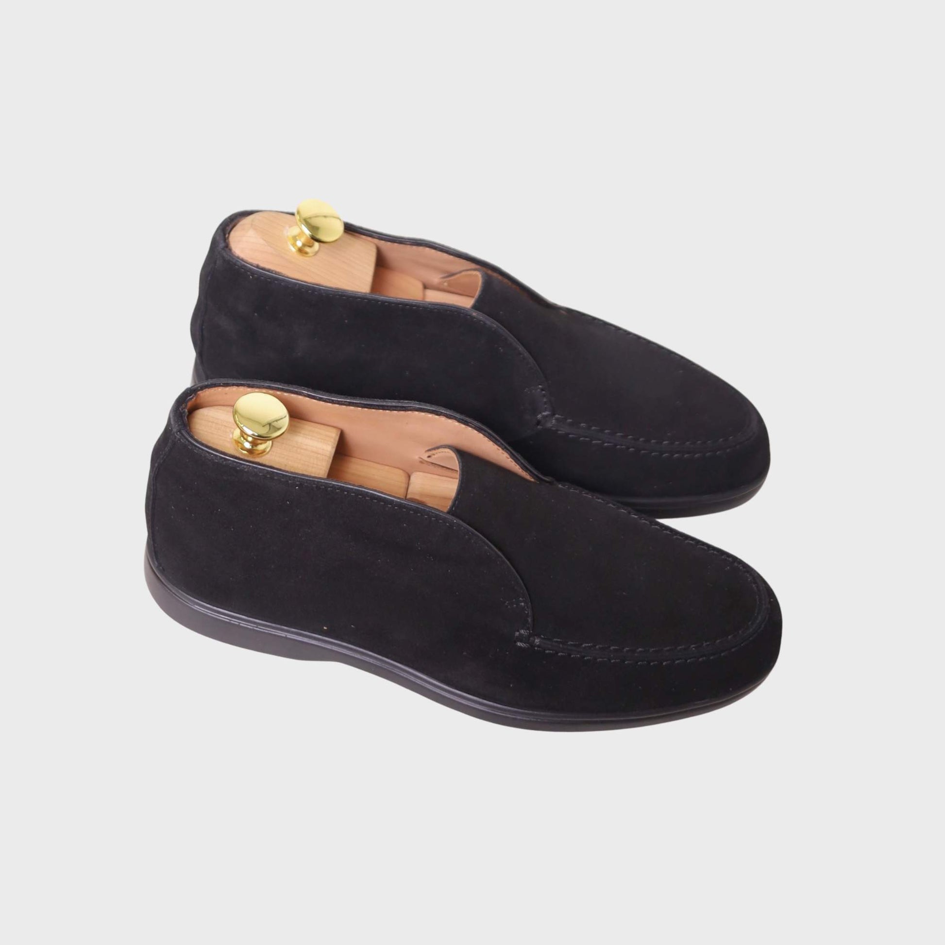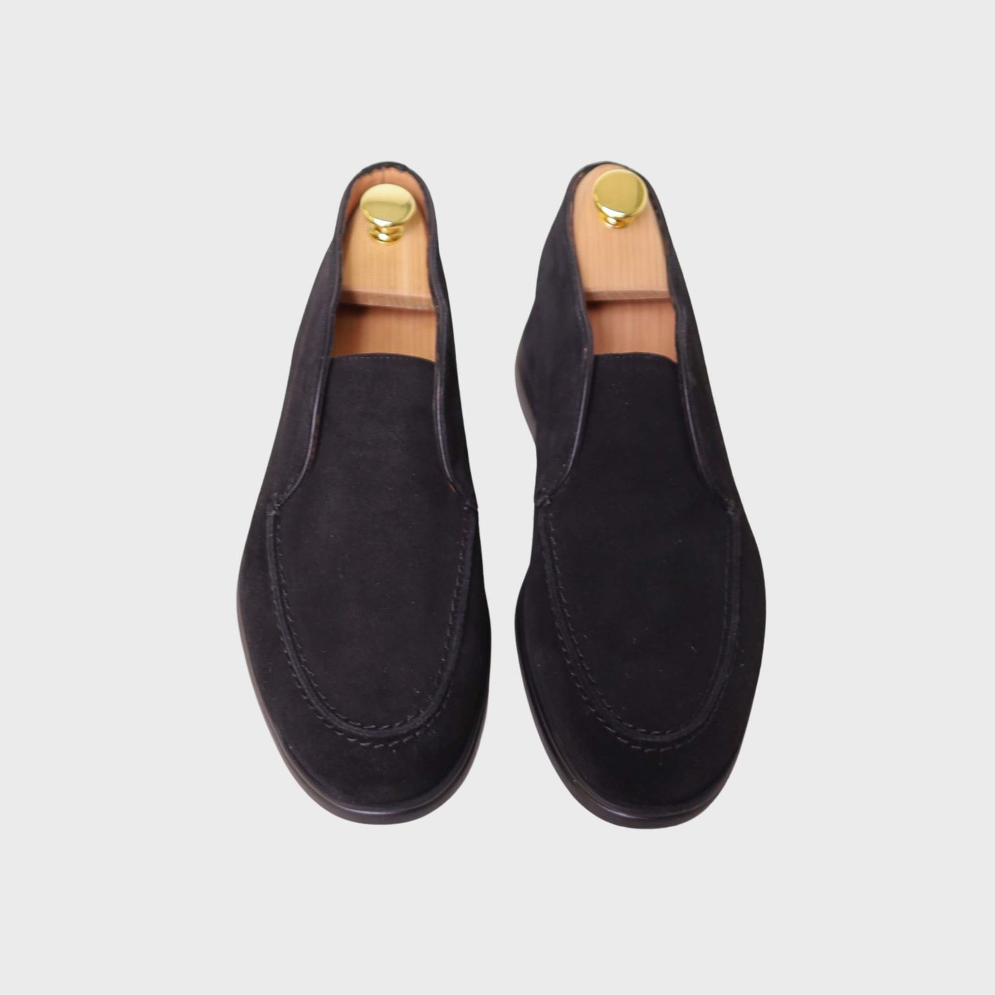 Das Modell kommt ohne Verschluss aus, was es besonders bequem macht und dem Design eine klare, minimalistische Linie verleiht. Der elastische Einstieg sorgt für festen Halt, während das Veloursleder dem Schuh eine edle, weiche Struktur gibt.