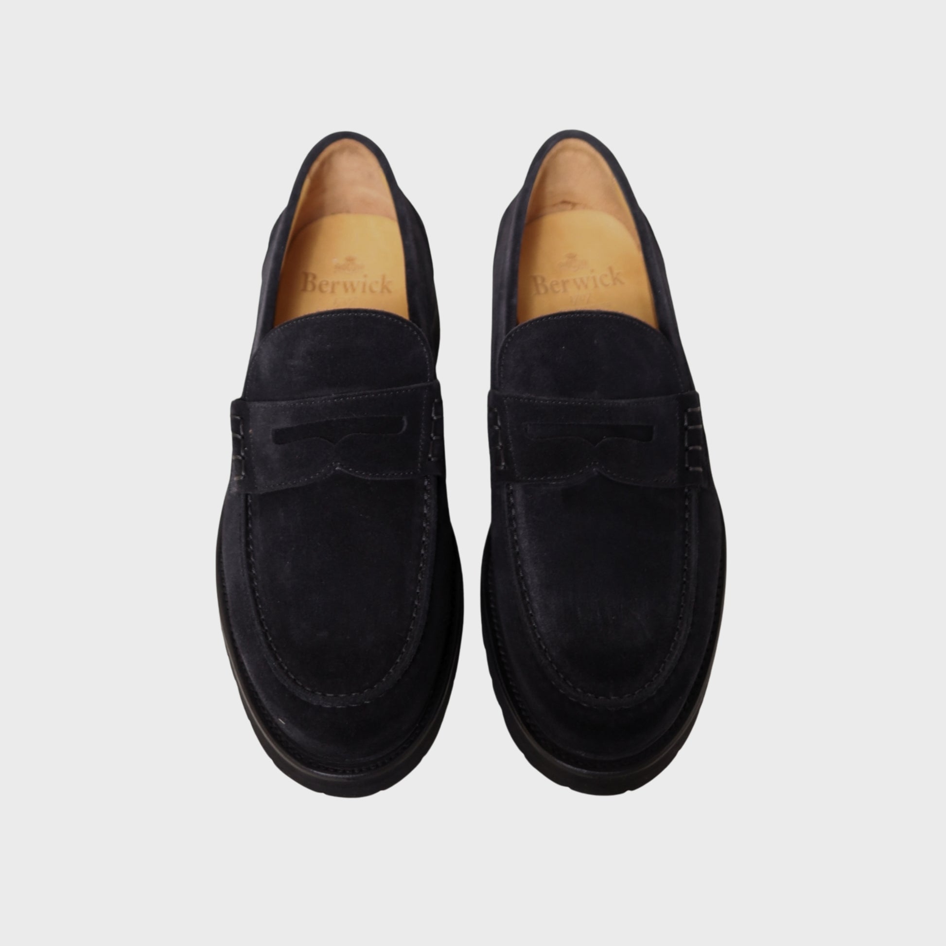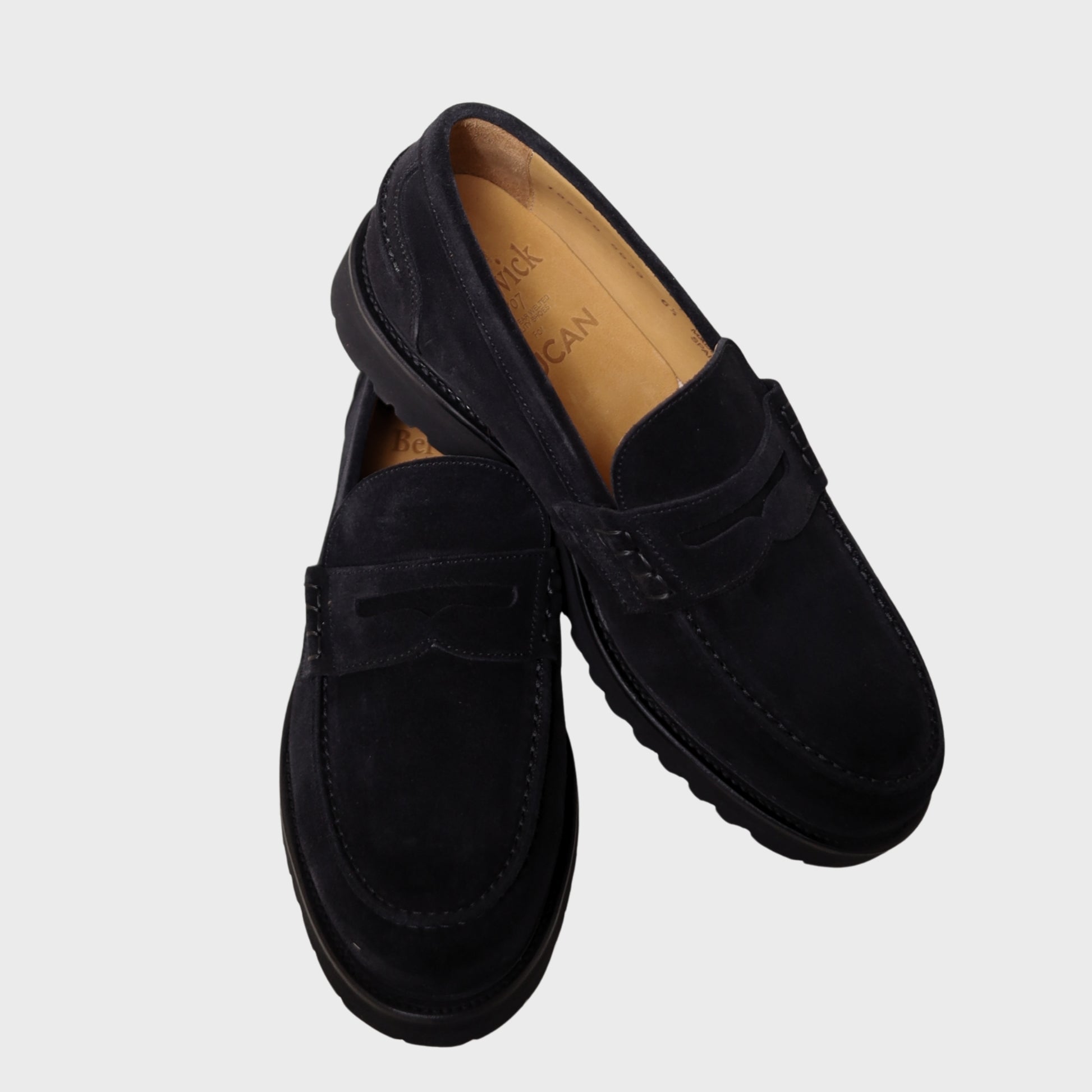 Zeitlose Penny Loafer aus hochwertigem Veloursleder – eine moderne Interpretation des Klassikers, entworfen für die kältere Jahreszeit. Das dichtere, strapazierfähige Leder und die stabile, markante Sohle bieten optimalen Halt und Komfort auch bei kühlerem Wetter.
